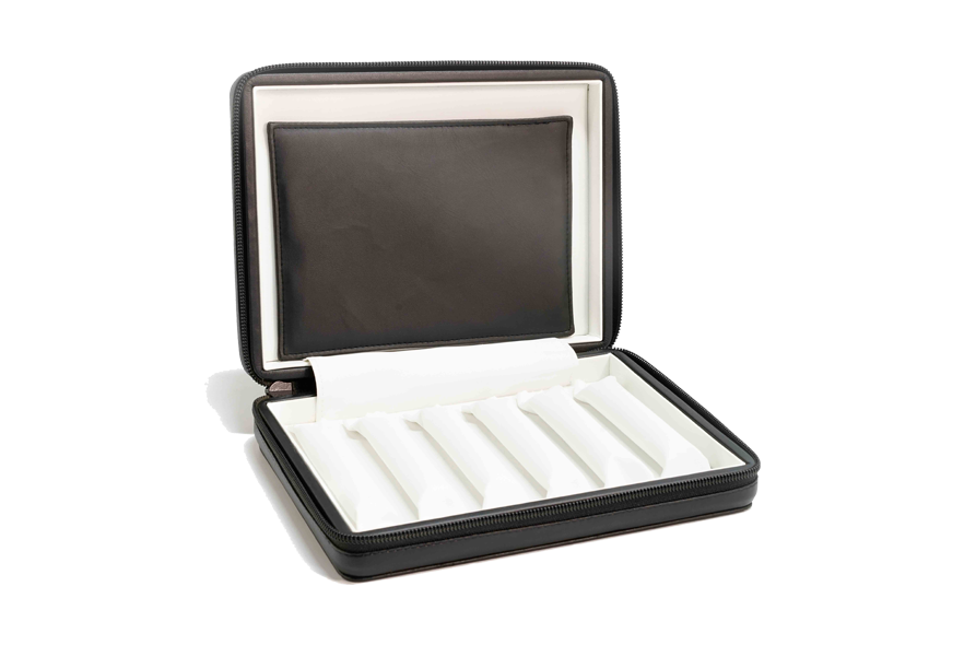 Astuccio in legno rivestito con salsicciotti per anelli e chiusura zip.