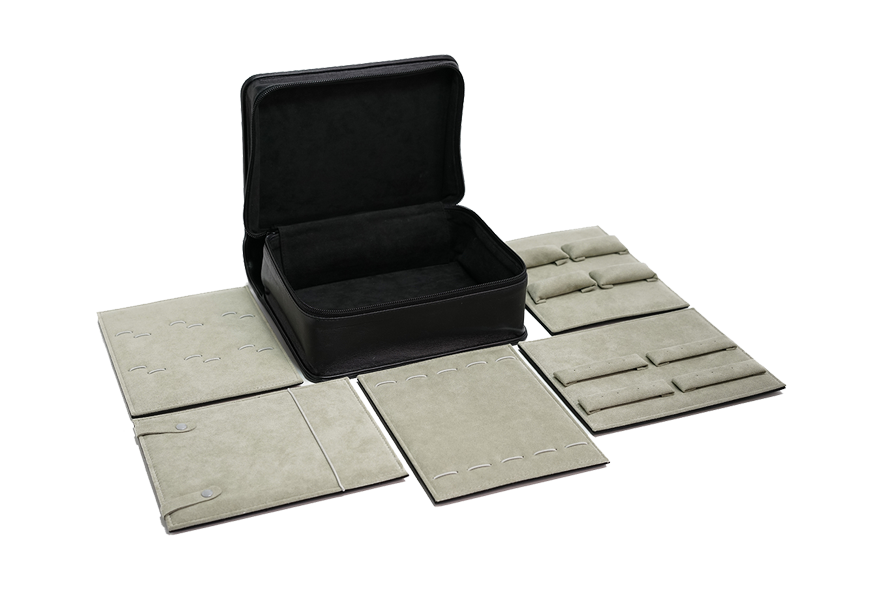 Morbido cofanetto con placchette per collana, orecchini, anelli, bracciali e chiusura zip.